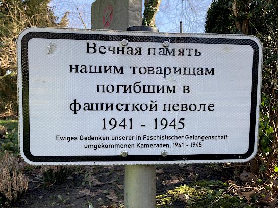 Der Gedenkstein und seine Umgebung sind stark zugewachsen. Im oberen Drittel des Gedenksteins ist ein (Sowjet-)Stern, mit Hammer und Sichel in der Mitte, eingraviert. Darunter steht eine Inschrift in kyrillischen Lettern, für die es leider keine Informationstafel mit Übersetzung gibt.